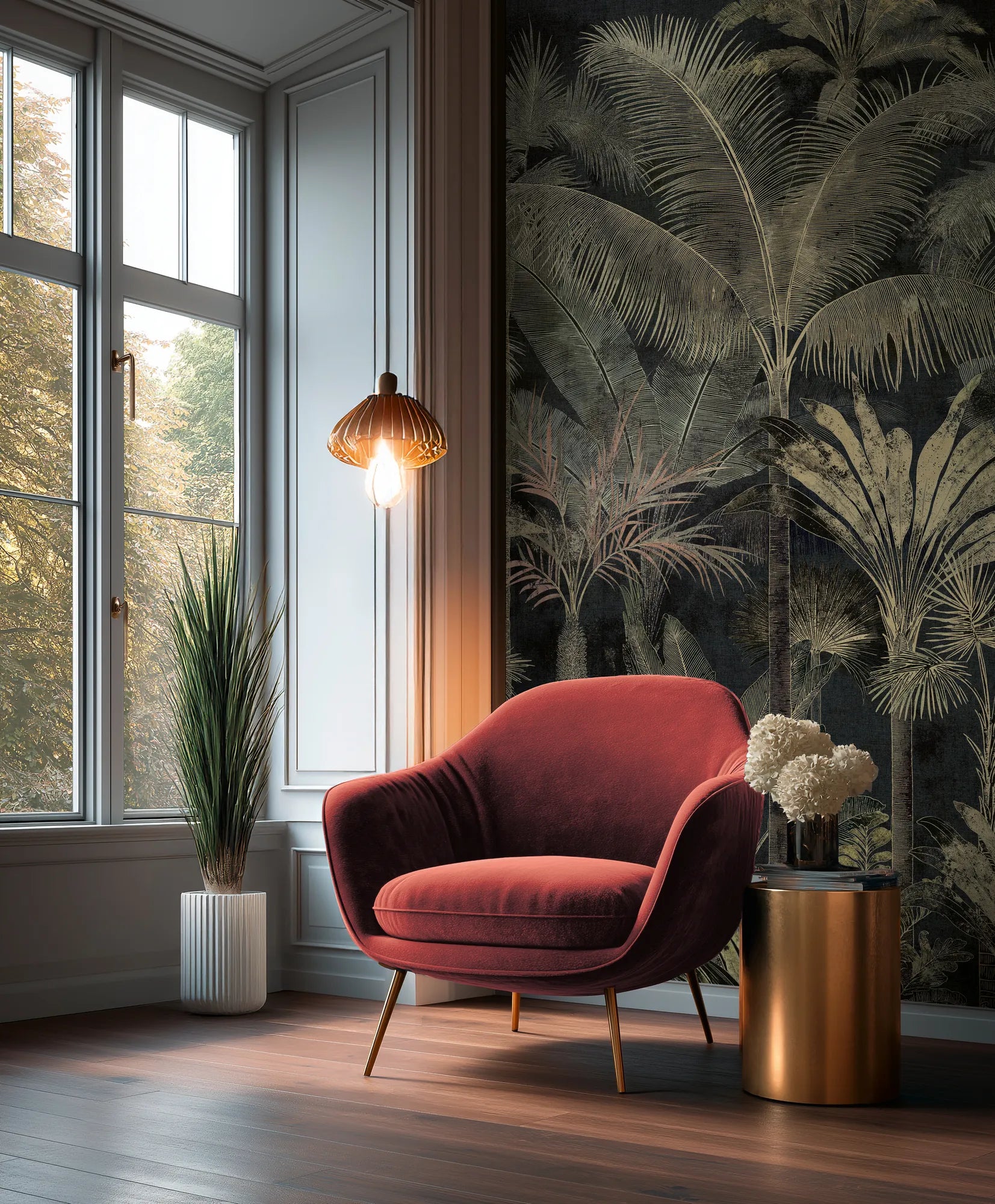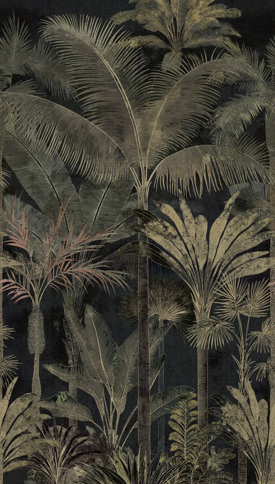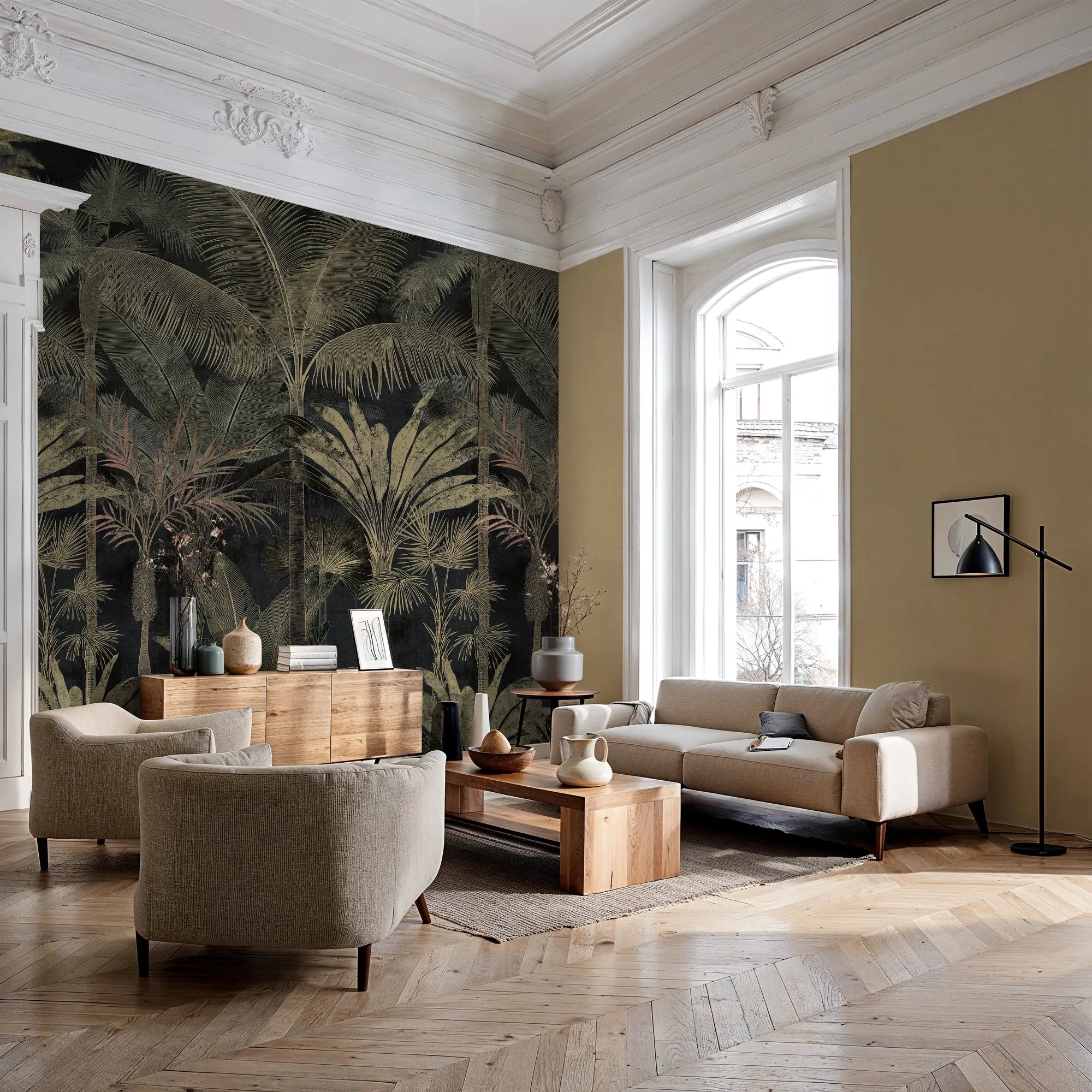 The Shadow Canopy mural pairs inky dark tones with elegant palm silhouettes for high-impact, low-noise sophistication. It grounds a space with contrast and texture, offering boldness without visual clutter.