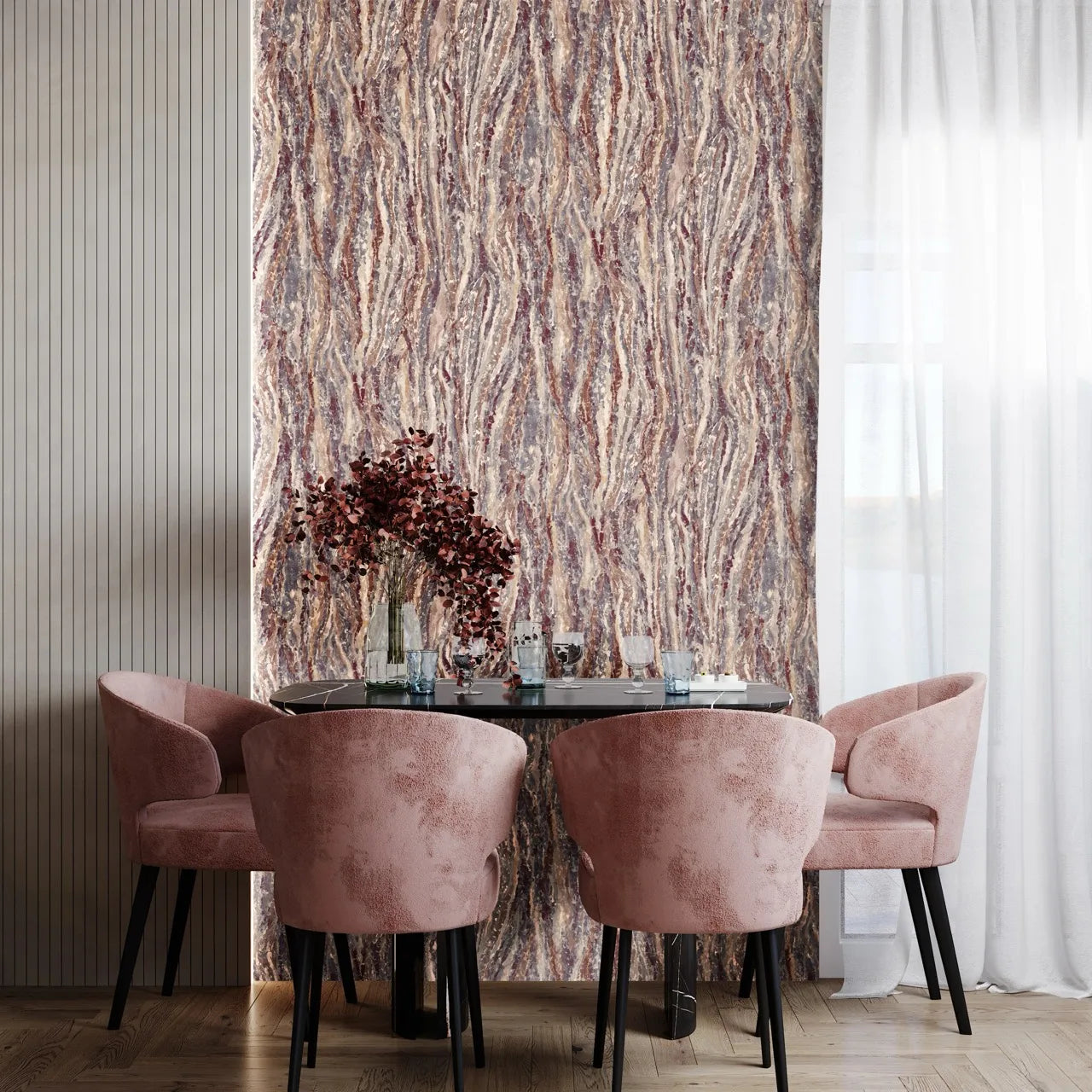 The Litos wallpaper is inspired by the layered beauty of natural rock formations and mineral surfaces. Vertical textures and subtle tonal variations create a lively sense of depth, bringing warmth and character to interior spaces. The design captures the authentic feel of natural materials while maintaining a refined, modern aesthetic. Its textured surface enhances the interplay of light and shadow, making it ideal for stylish accent walls in living rooms, bedrooms, or dining areas. Paired with wood, textiles, and soft natural tones, Litos creates a calm, welcoming atmosphere that feels both sophisticated and grounded.